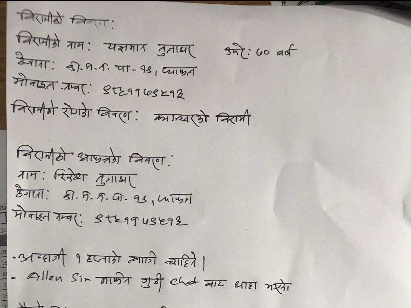 living in Ward No 2, Sano Bharyang, Nagarjuna Municipality, Kathmandu is a COVID-19 victing and also has pneumonia. Her oxygen saturation is currently at 80% and the doctor has adviced to give oxygen while monitoring her SPO2 at home.